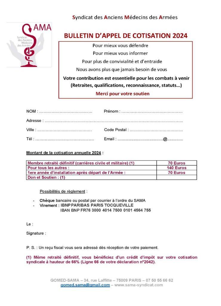 Votre devoir premier est de régler votre cotisation 2024, celle-ci est nécessaire pour la pérennité de notre action et pour la survie du SAMA.