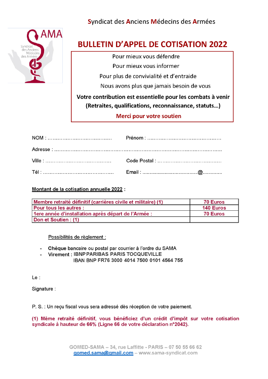 N’oubliez pas de régler votre cotisation 2022, celle-ci est nécessaire pour la survie du SAMA.