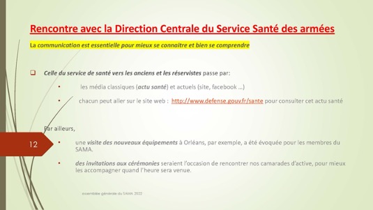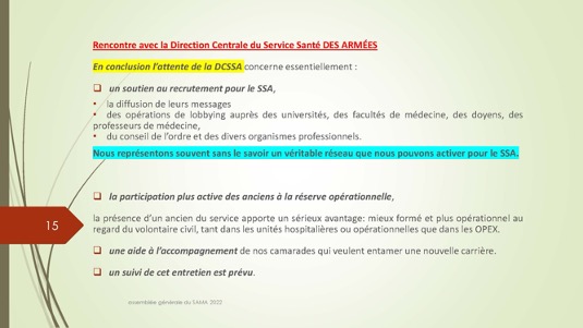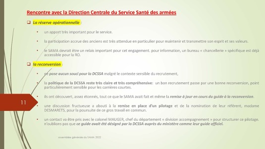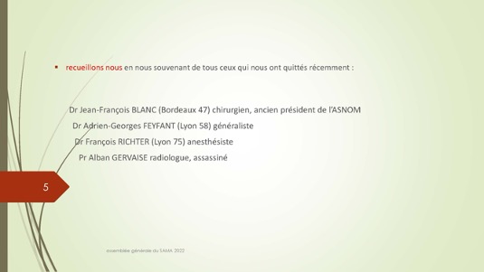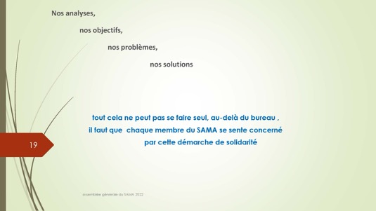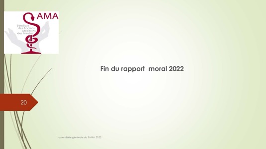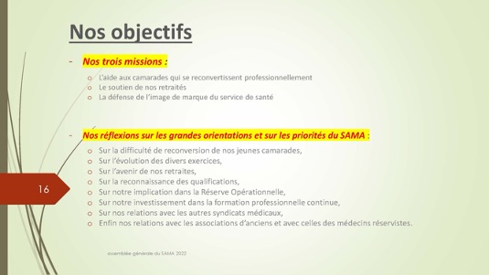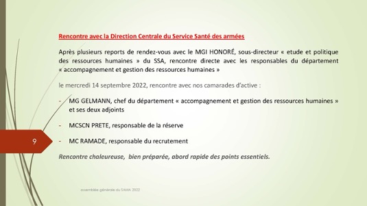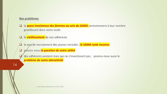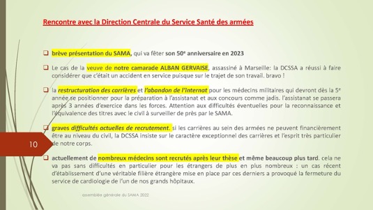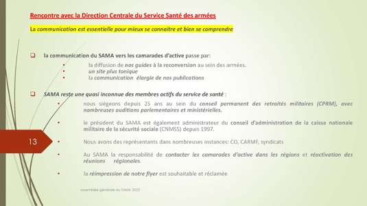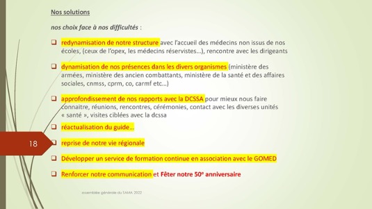 Chers amis,Le 30 septembre 1972 se créait autour du Docteur Jacques Henri Baixe à Toulon l’AMA, association d’anciens médecins des armées regroupés pour défendre leurs intérêts professionnels en particulier face à la CARMF : Voilà donc 50 ans que cette volonté se manifestait publiquement de se solidariser pour faire face à des problèmes inhérents à notre statut. Quelques mois plus tard l’AMA devait se transformer en SAMA afin de pouvoir ester en justice dans le cadre du code du travail pour récupérer les retraites injustement spoliées.De cette période très peu d’entre nous sont encore là et seul Louis Reymondon a dû participer à ces toutes premières réunions. Si un demi-siècle plus tard, le SAMA est toujours debout, c’est qu’il a dû répondre avec succès à un certain nombre de ses missions dont les 3 principales sont d’aider à la reconversion des médecins des armées, de veiller sur nos retraites et de défendre l’image de marque du Service de Santé des Armées. Nous n’en serons jamais assez reconnaissants à ces générations de camarades qui se sont dévoués pour assurer cette continuité, à l’image entre autres de notre si fidèle Yves Pirame.Le combat est-il fini ? Sommes-nous arrivés à surmonter toutes les difficultés et aider à résoudre tous les problèmes ? Les perspectives sont-elles définitivement claires pour les médecins et en particulier pour les anciens médecins des armées ? Au regard du peu de volontaires pour assumer quelques responsabilités, du peu d’enthousiasme que soulèvent nos diverses activités, du peu d’adhérents qui se manifestent, on serait porté à le croire… !Et pourtant je ne suis pas si naïf et je connais les difficultés rencontrées par certains pour se reconvertir dans de bonnes conditions, pour faire valoriser leurs acquis, pour toucher l’intégralité d’une retraite méritée, pour concilier activité professionnelle et Réserve Opérationnelle, et nombre d’autres sujets professionnels et familiaux. Le SAMA se justifie encore pleinement.Alors peut-on abandonner ce drapeau érigé il y a 50 ans par ces camarades à la fois lucides et généreux lorsque que nous bénéficions tous des dispositions acquises parfois au prix de rudes combats juridiques, politiques et économiques entre autres ? Le confort de nos vies personnelles et la surcharge de travail ne doivent pas nous faire oublier qu’il faut poursuivre l’aménagement de cette route tracée depuis un demi-siècle. Les circonstances actuelles sont propices à ce réengagement car notre bureau évolue et les axes de travail sont plus spécifiquement identifiés : notre président sortant Gérard Desmaris pour des raisons de santé persistantes a dû laisser la place et notre secrétaire général Michel Robert surchargé par d’autres responsabilités s’est également mis en retrait.  Qu’il en soit tous les deux très sincèrement remerciés et sûrs de notre profonde reconnaissance. Nous comptons toujours sur eux pour des missions plus ponctuelles.  Ainsi donc notre nouveau cadre et notre fidèle Catherine vont permettre à notre nouveau bureau de travailler toujours plus efficacement comme vous pourrez le voir dans le rapport moral de notre dernière AG. Elle a confié le secrétariat général à Pierre Leroy, consolidé sa confiance à Xavier Loniewski pour faire des miracles avec notre trésorerie, et n’a trouvé d’autre successeur pour la présidence que moi-même en attendant un candidat ou une candidate pour le prochain mandat. Notre nouvelle équipe, faite d’anciens, va néanmoins pouvoir faire face avec enthousiasme aux problèmes qui surgissent (suppression de l’internat pour les militaires, remise en cause des équivalences de titre, réforme des retraites, refonte du Guide, etc…). Mais est-ce bien normal de ne pas trouver de plus jeunes pour ces charges si déterminantes ?Les temps changent et l’individualisme prévaut.Lorsque les vents sont contraires, il faut se rassembler, se donner les moyens d’agir et retrousser les manches. Je veux croire que nous pouvons compter sur chacun d’entre vous.La prochaine occasion de le montrer va être notre traditionnel repas de fin d’année le 17 décembre sur un bateau-mouche à Paris au cours duquel sera tirée notre tombola si nécessaire à notre fonctionnement. Venez nombreux nous rejoindre, seuls ou accompagnés, pour entretenir notre camaraderie qui n’est pas un vain mot. Présents ou dans l’impossibilité de nous rejoindre, prenez des billets pour cette tombola : ses revenus ne servent exclusivement qu’à poursuivre ce travail entrepris par une bande de copains qui refusaient de croire à la fatalité et savaient que l’union faisait la force ;A très bientôt donc et longue vie au SAMA.